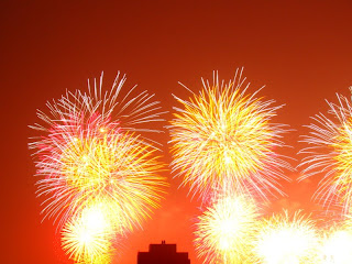 Exactamente a las 8:30 pm escuche una gran explosion, vivo bien cerca de la bahia, como a 4 cuadras, entonces abri la ventana y vi tantas luces, sin dudarlo, me fui a la terraza, saque la camara y empece a tomar fotos.... lastima que habia un edificio grandote tapando 25% de la vision, pero igual, era impresionante, Amy me dijo despues que eran barcos en el mar, ubicados a lo largo de la bahia, por eso se veian tan grandes y muchos, y me dijo que lo que vi, en realidad solo fue una parte, el espectaculo ahi fue quizas 5 veces mayor, ella estaba en un restaurante que "se mueve" para tener vista panoramica de la ciudad, asi que todo mundo se iba moviendo para mantenerse viendolos jajajja!